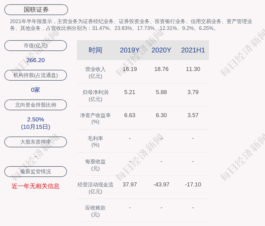 2021年半年報(bào)顯示,國聯(lián)證券的主營業(yè)務(wù)為證券經(jīng)紀(jì)業(yè)務(wù)、證券投資業(yè)務(wù)、投資銀行業(yè)務(wù)、信用交易業(yè)務(wù)、資產(chǎn)管理業(yè)務(wù)、其他業(yè)務(wù),占營收比例分別為:31.47%、23.83%、17.73%、12.31%、9.2%、6.25%。