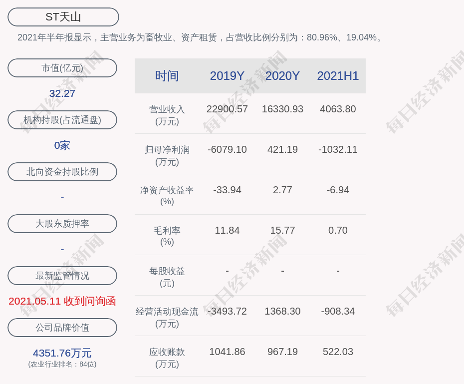 2021年半年報(bào)顯示,ST天山的主營(yíng)業(yè)務(wù)為畜牧業(yè)、資產(chǎn)租賃,占營(yíng)收比例分別為:80.96%、19.04%。
