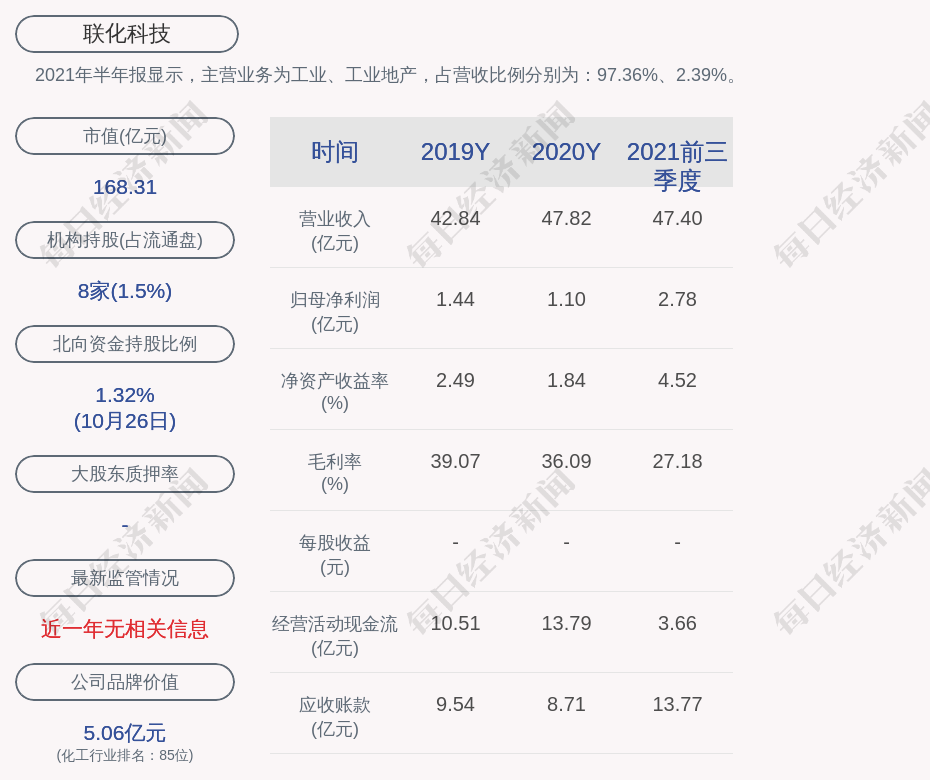 2021年半年報顯示,聯(lián)化科技的主營業(yè)務為工業(yè)、工業(yè)地產(chǎn),占營收比例分別為:97.36%、2.39%。