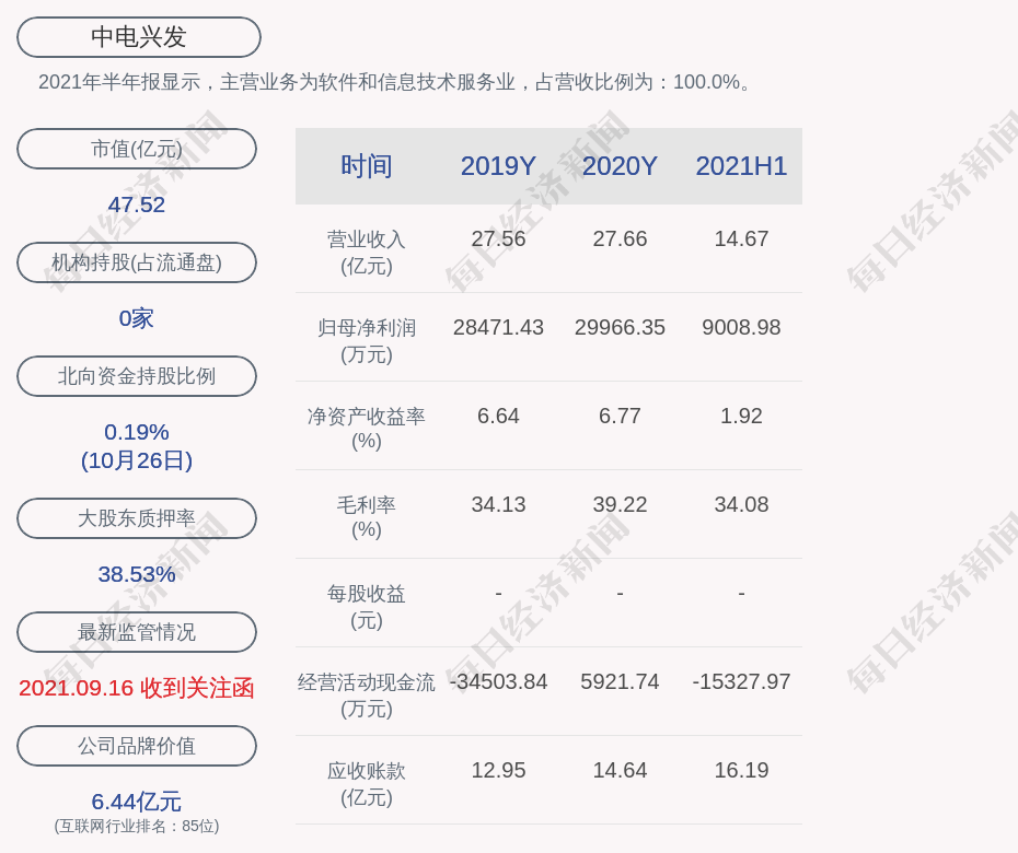 2021年半年報顯示,中電興發(fā)的主營業(yè)務(wù)為軟件和信息技術(shù)服務(wù)業(yè),占營收比例為:100.0%。