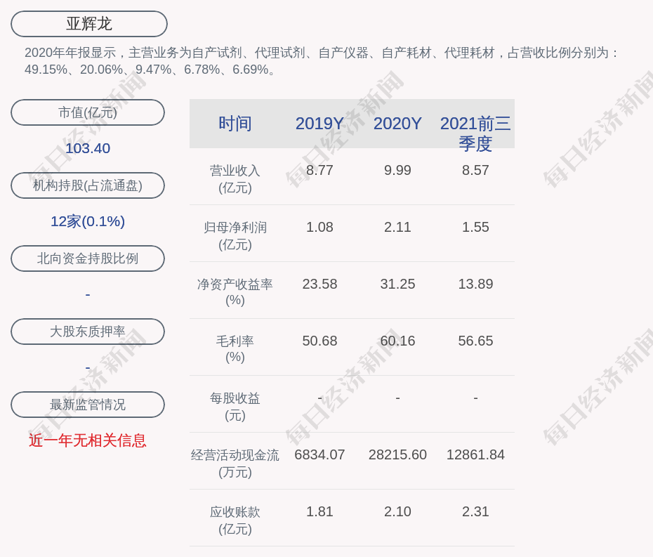 2020年年報顯示,亞輝龍的主營業(yè)務為自產(chǎn)試劑、代理試劑、自產(chǎn)儀器、自產(chǎn)耗材、代理耗材,占營收比例分別為:49.15%、20.06%、9.47%、6.78%、6.69%。