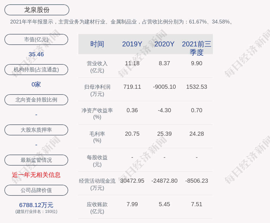 2021年半年報顯示,龍泉股份的主營業(yè)務(wù)為建材行業(yè)、金屬制品業(yè),占營收比例分別為:61.67%、34.58%。
