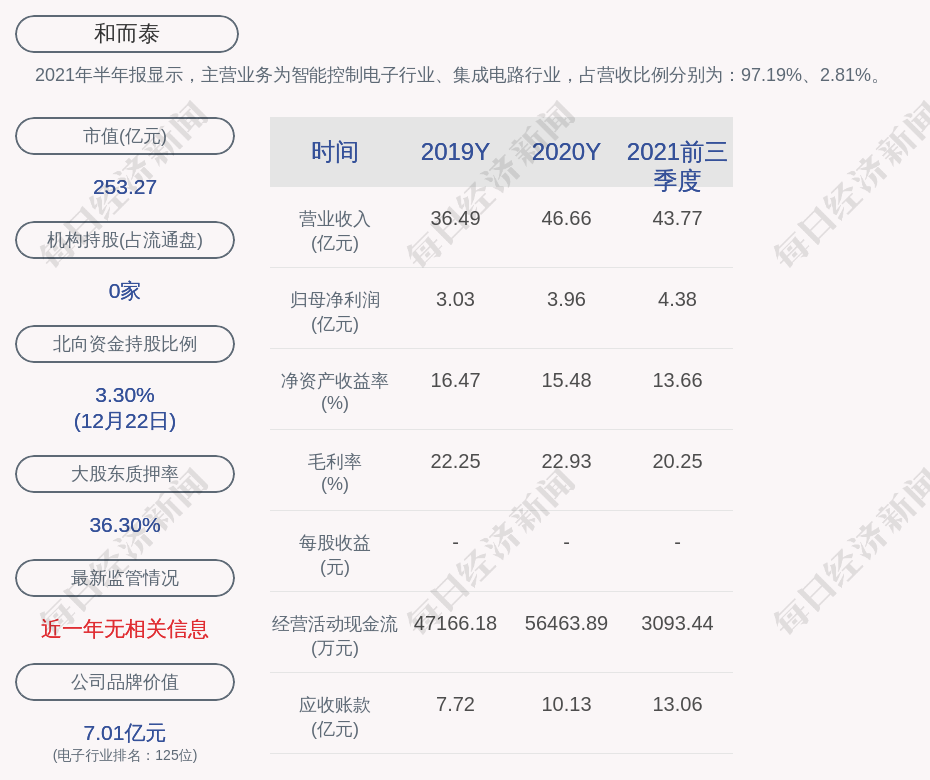 2021年半年報(bào)顯示,和而泰的主營(yíng)業(yè)務(wù)為智能控制電子行業(yè)、集成電路行業(yè),占營(yíng)收比例分別為:97.19%、2.81%。