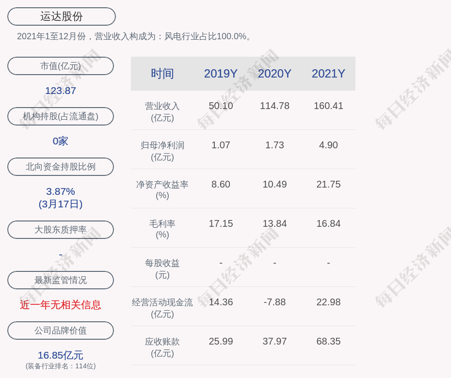 2021年1至12月份,運達股份的營業(yè)收入構(gòu)成為:風(fēng)電行業(yè)占比100.0%。