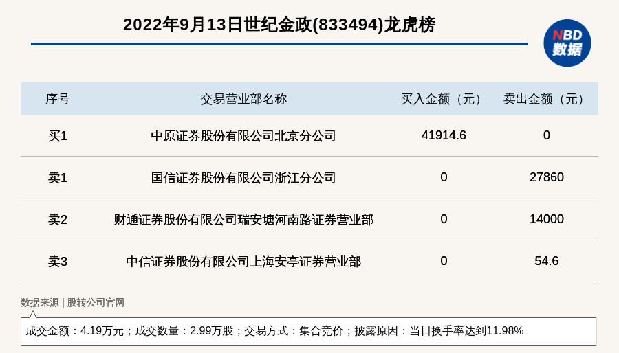 每經(jīng)訊,2022年9月13日,新三板基礎(chǔ)層公司世紀金政(833494)登上龍虎榜,交易方式是集合競價,披露原因是當(dāng)日換手率達到11.98%,成交數(shù)量2.99萬股,成交金額4.19萬元。買一席位為中原證券股份有限公司北京分公司,買入4.19萬元;賣一席位為國信證券股份有限公司浙江分公司,賣出2.79萬元。