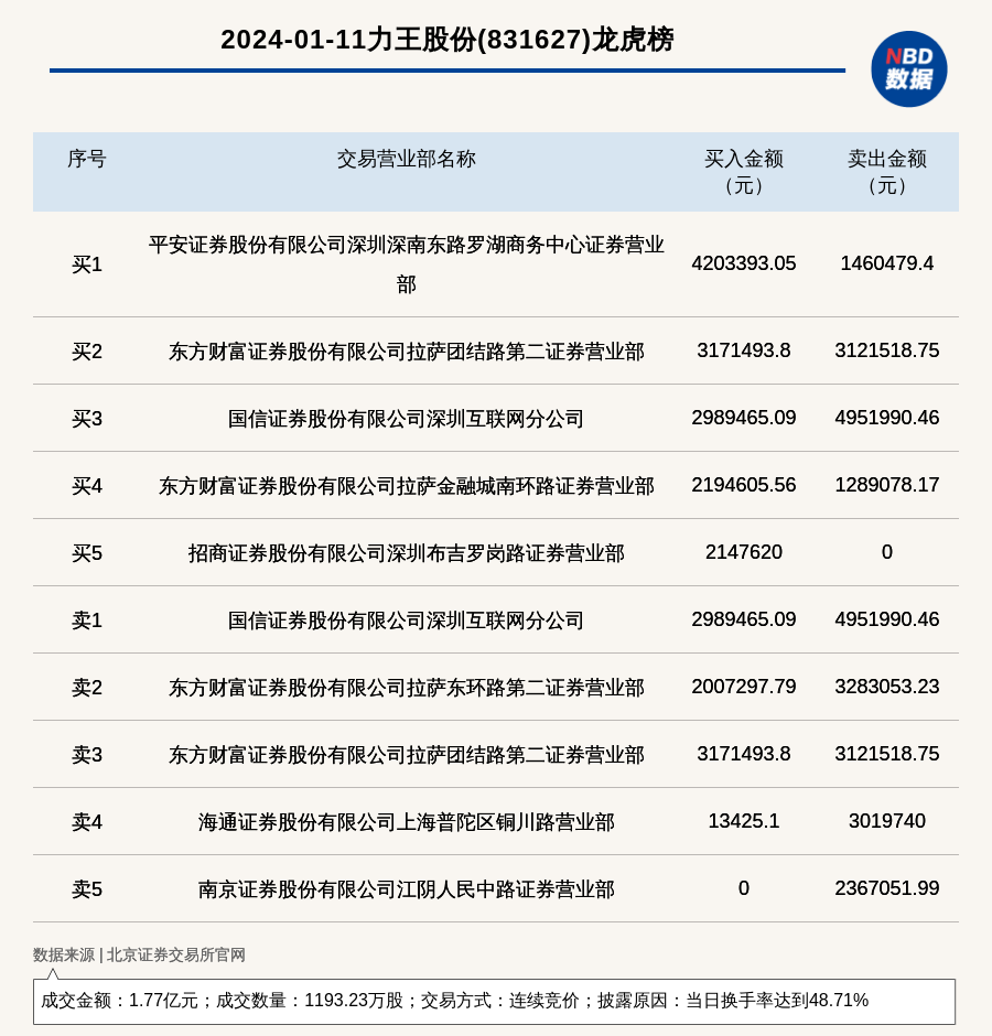 每經(jīng)訊,2024年1月11日,北交所上市公司力王股份(831627,收盤價:15.44元)登上龍虎榜,交易方式是連續(xù)競價,披露原因是當日換手率達到48.71%,成交數(shù)量1193.23萬股,成交金額1.77億元。買一席位為平安證券股份有限公司深圳深南東路羅湖商務中心證券營業(yè)部,買入420.34萬元;賣一席位為國信證券股份有限公司深圳互聯(lián)網(wǎng)分公司,賣出495.2萬元。
