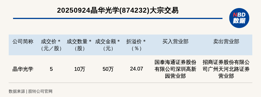 每經(jīng)訊,2025年9月24日,新三板創(chuàng)新層公司晶華光學(xué)(874232,收盤價(jià):4.03元)發(fā)生一筆大宗交易,成交價(jià)5元/股,成交數(shù)量10萬股,成交金額50萬元,溢價(jià)24.07%。買入營業(yè)部是國泰海通證券股份有限公司深圳高新園營業(yè)部,賣出營業(yè)部是招商證券股份有限公司廣州天河北路證券營業(yè)部。