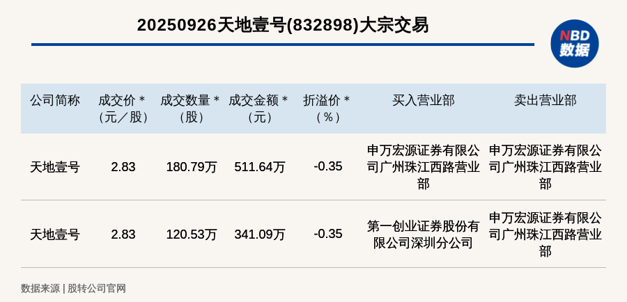 每經(jīng)訊,2025年9月26日,新三板創(chuàng)新層公司天地壹號(832898,收盤價(jià):2.84元)發(fā)生2筆大宗交易,總成交金額為852.74萬元,成交金額最高的一筆成交價(jià)2.83元/股,成交數(shù)量180.79萬股,成交金額511.64萬元,折價(jià)0.35%。買入營業(yè)部是申萬宏源證券有限公司廣州珠江西路營業(yè)部,賣出營業(yè)部是申萬宏源證券有限公司廣州珠江西路營業(yè)部。