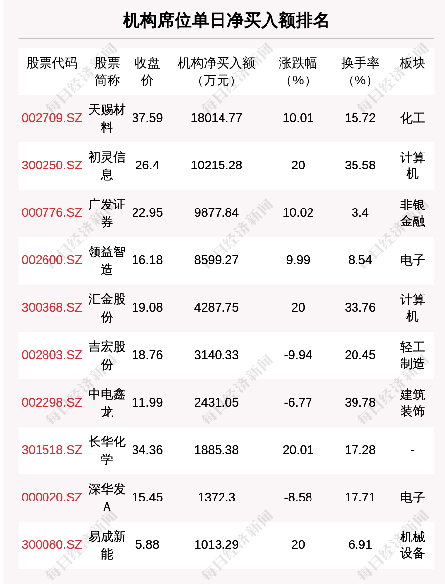 在龍虎榜中,涉及機(jī)構(gòu)專用席位的個股有25只,凈買入額前三的是天賜材料、初靈信息、廣發(fā)證券,分別為1.8億元、1.02億元、9877.84萬元。