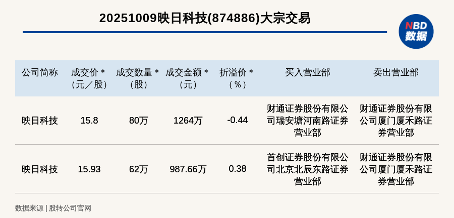 每經(jīng)訊,2025年10月9日,新三板創(chuàng)新層公司映日科技(874886,收盤(pán)價(jià):15.87元)發(fā)生2筆大宗交易,總成交金額為2251.66萬(wàn)元,成交金額最高的一筆成交價(jià)15.8元/股,成交數(shù)量80萬(wàn)股,成交金額1264萬(wàn)元,折價(jià)0.44%。買(mǎi)入營(yíng)業(yè)部是財(cái)通證券股份有限公司瑞安塘河南路證券營(yíng)業(yè)部,賣出營(yíng)業(yè)部是財(cái)通證券股份有限公司廈門(mén)廈禾路證券營(yíng)業(yè)部。