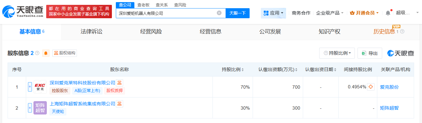 每經(jīng)AI快訊,天眼查App顯示,近日,深圳愛矩機(jī)器人有限公司成立,法定代表人為張鋒斌,注冊資本1000萬元人民幣,經(jīng)營范圍包括工業(yè)機(jī)器人銷售、工業(yè)機(jī)器人制造、智能機(jī)器人銷售等。股東信息顯示,該公司由愛克股份(300889)、上海矩陣超智系統(tǒng)集成有限公司共同持股。