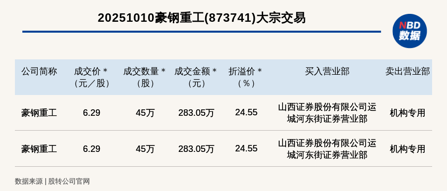 每經(jīng)訊,2025年10月10日,新三板創(chuàng)新層公司豪鋼重工(873741,收盤價:5.05元)發(fā)生2筆大宗交易,總成交金額為566.1萬元,成交金額最高的一筆成交價6.29元/股,成交數(shù)量45萬股,成交金額283.05萬元,溢價24.55%。買入營業(yè)部是山西證券股份有限公司運城河?xùn)|街證券營業(yè)部,賣出營業(yè)部是機構(gòu)專用。