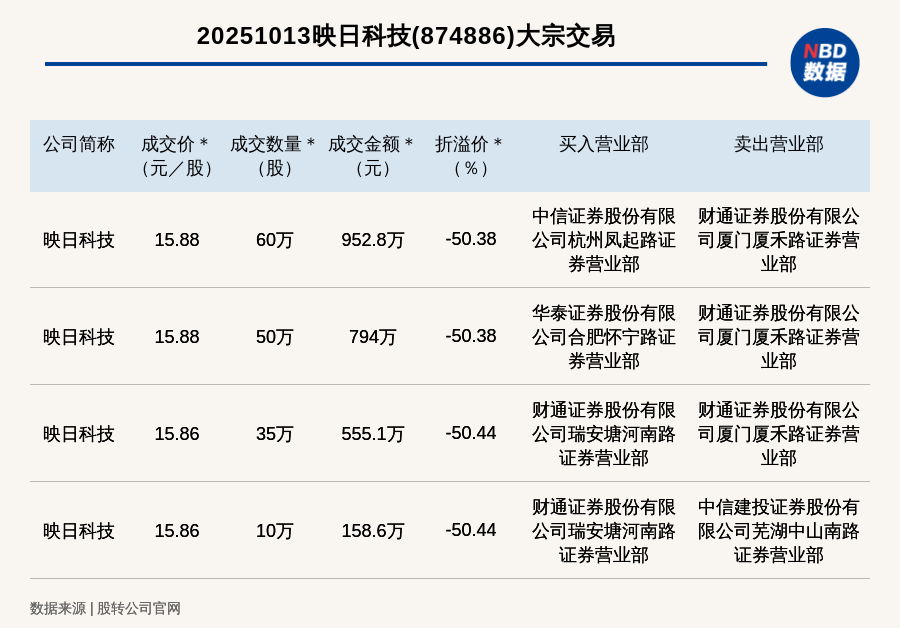 每經(jīng)訊,2025年10月13日,新三板創(chuàng)新層公司映日科技(874886,收盤(pán)價(jià):32元)發(fā)生4筆大宗交易,總成交金額為2460.5萬(wàn)元,成交金額最高的一筆成交價(jià)15.88元/股,成交數(shù)量60萬(wàn)股,成交金額952.8萬(wàn)元,折價(jià)50.38%。買入營(yíng)業(yè)部是中信證券股份有限公司杭州鳳起路證券營(yíng)業(yè)部,賣出營(yíng)業(yè)部是財(cái)通證券股份有限公司廈門廈禾路證券營(yíng)業(yè)部。