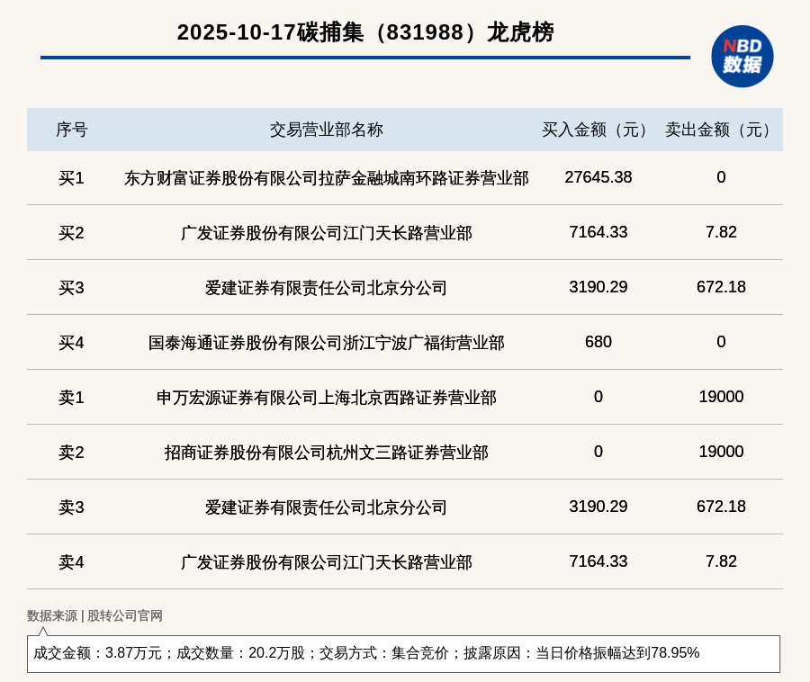 每經(jīng)訊,2025年10月17日,新三板基礎層公司碳捕集(831988,收盤價:0.34元)登上龍虎榜,交易方式是集合競價,披露原因是當日價格振幅達到78.95%,成交數(shù)量20.2萬股,成交金額3.87萬元。買一席位為東方財富證券股份有限公司拉薩金融城南環(huán)路證券營業(yè)部,買入2.76萬元;賣一席位為申萬宏源證券有限公司上海北京西路證券營業(yè)部,賣出1.9萬元。