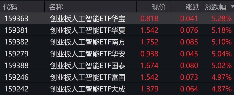 受盤面影響,創(chuàng)業(yè)板人工智能相關(guān)ETF漲約5%。