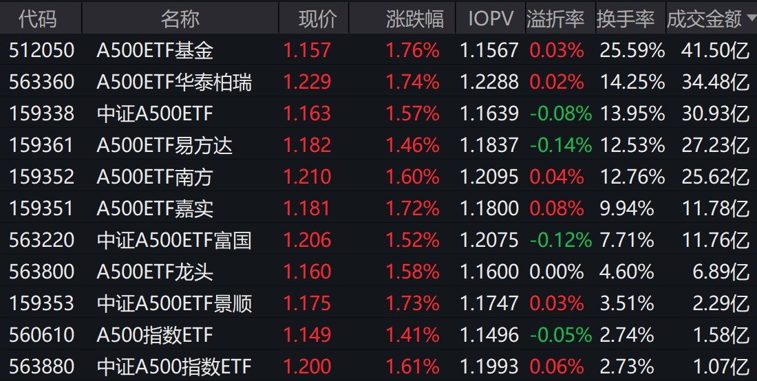 截至上午收盤,場內(nèi)跟蹤中證A500指數(shù)的ETF漲超1%。其中,有11只中證A500相關(guān)ETF成交額超1億元,3只超30億元。A500ETF基金、A500ETF華泰柏瑞、中證A500ETF早盤成交額分別為41.5億元、34.48億元、30.93億元。