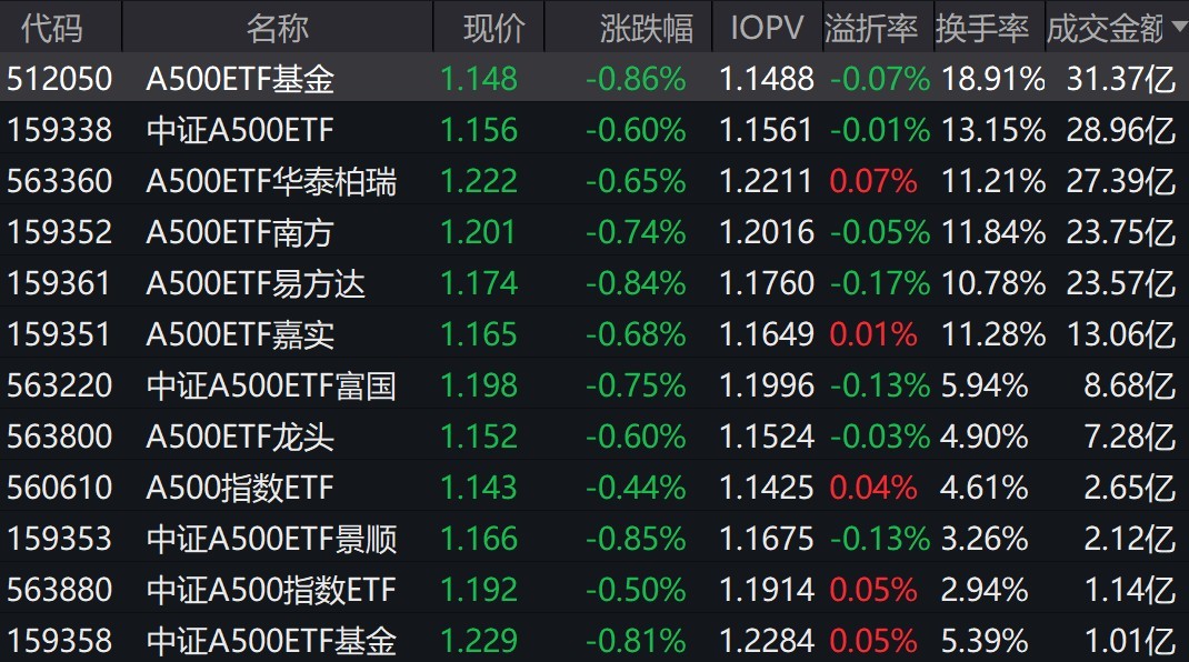 截至上午收盤,場(chǎng)內(nèi)跟蹤中證A500指數(shù)的ETF小幅下跌。其中,有12只中證A500相關(guān)ETF成交額超1億元,3只超27億元。A500ETF基金、中證A500ETF、A500ETF華泰柏瑞早盤成交額分別為31.37億元、28.96億元、27.39億元。