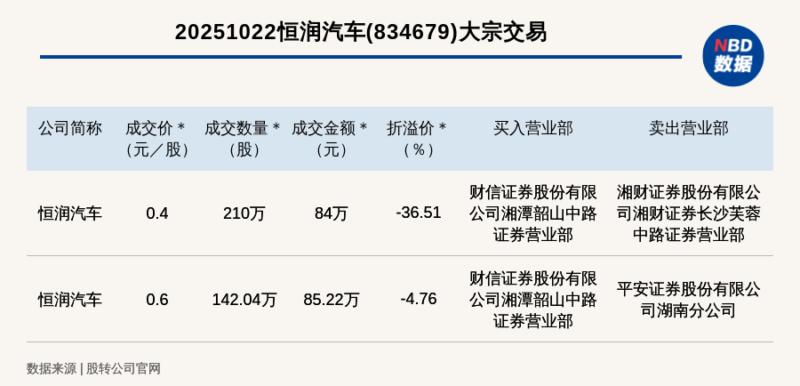 每經(jīng)訊,2025年10月22日,新三板創(chuàng)新層公司恒潤(rùn)汽車(834679,收盤價(jià):0.63元)發(fā)生2筆大宗交易,折價(jià)率最高的一筆成交價(jià)0.4元/股,成交數(shù)量210萬股,成交金額84萬元,折價(jià)36.51%。買入營(yíng)業(yè)部是財(cái)信證券股份有限公司湘潭韶山中路證券營(yíng)業(yè)部,賣出營(yíng)業(yè)部是湘財(cái)證券股份有限公司湘財(cái)證券長(zhǎng)沙芙蓉中路證券營(yíng)業(yè)部。