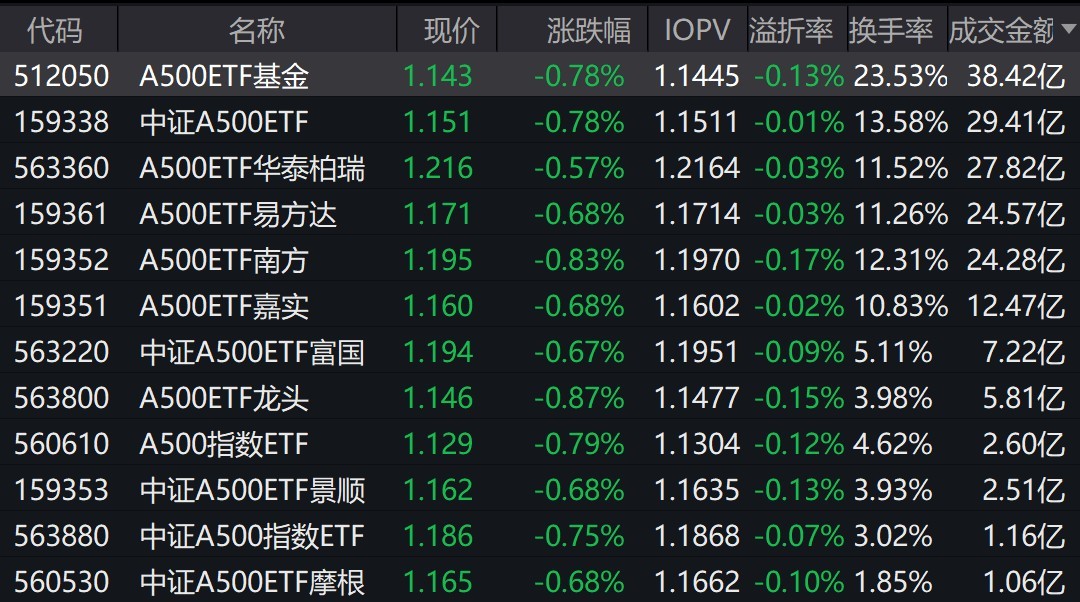 市場(chǎng)早盤震蕩調(diào)整,量能再度萎縮,中證A500指數(shù)下跌0.72%。