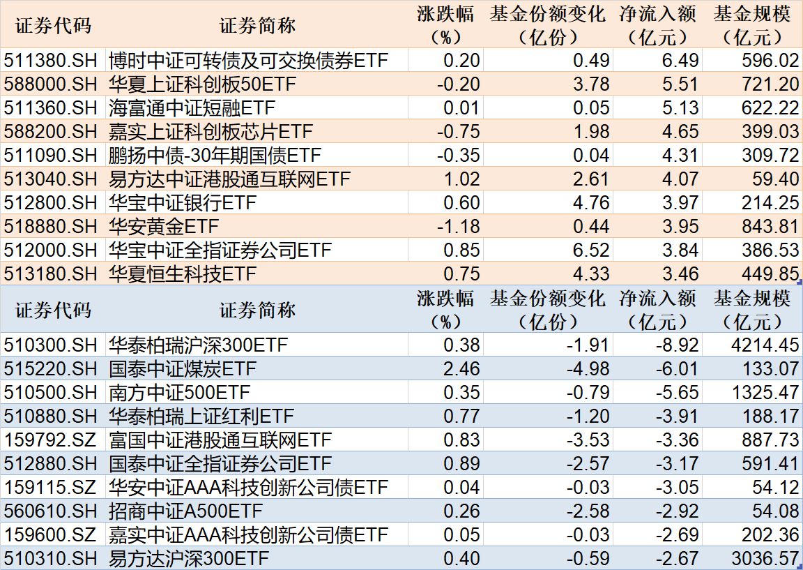與此同時,華泰柏瑞滬深300ETF基金份額減少1.91億份,凈流出額為8.92億元;國泰中證煤炭ETF基金份額減少4.98億份,凈流出額為6.01億元;南方中證500ETF基金份額減少0.79億份,凈流出額為5.65億元。