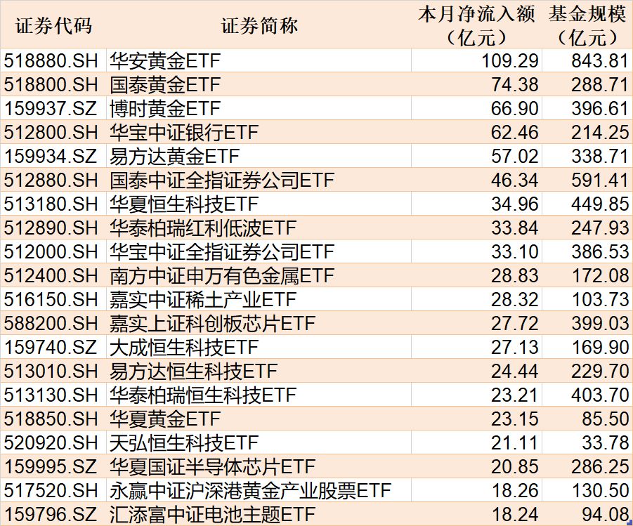 截至10月23日,本月資金凈流入額居前20的ETF名單如下: