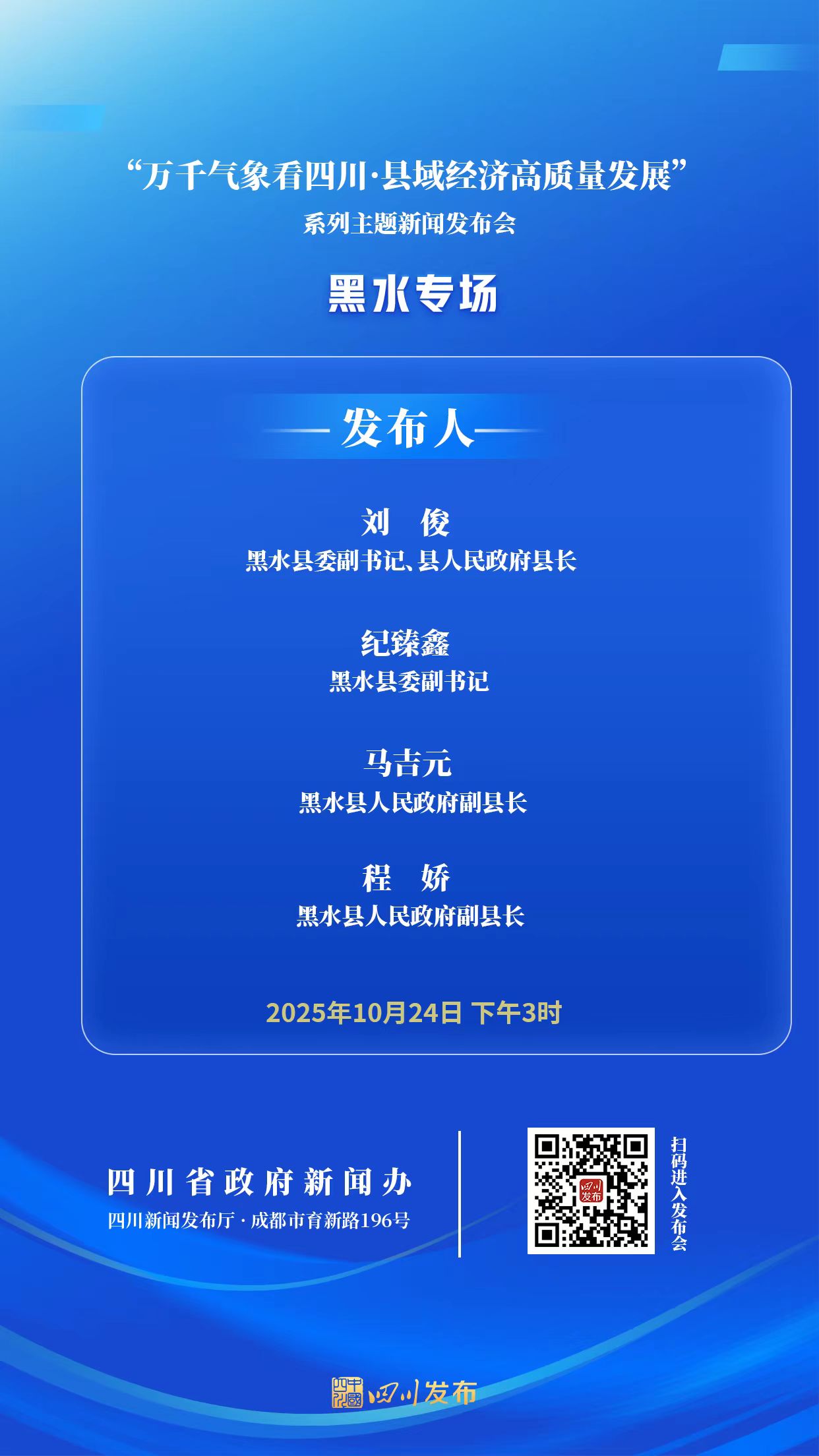 2025年10月24日(星期五)15:00,省政府新聞辦將在四川新聞發(fā)布廳舉行“萬千氣象看四川·縣域經(jīng)濟高質(zhì)量發(fā)展”系列主題新聞發(fā)布會黑水專場,黑水縣委副書記、縣人民政府縣長劉俊圍繞“生態(tài)引領、五維賦能描繪民族地區(qū)高質(zhì)量發(fā)展綠色答卷”作介紹并答記者問,黑水縣委副書記紀臻鑫,黑水縣人民政府副縣長馬吉元、副縣長程嬌答記者問。四川發(fā)布客戶端將全程圖文直播,敬請關注!