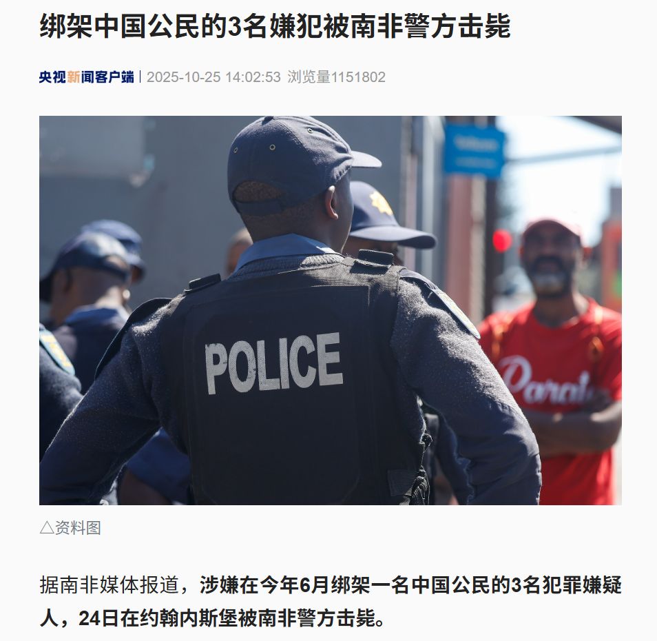 據(jù)央視新聞,南非媒體報道,涉嫌在今年6月綁架一名中國公民的3名犯罪嫌疑人,24日在約翰內(nèi)斯堡被南非警方擊斃。