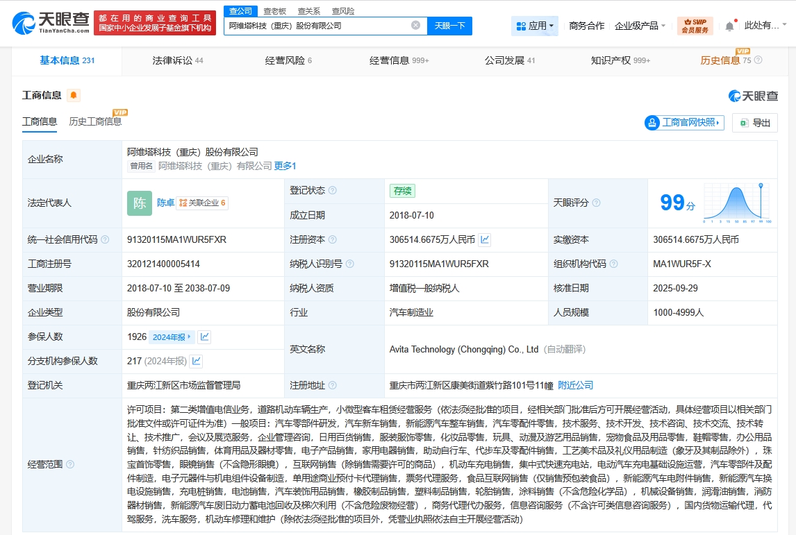 每經(jīng)AI快訊,天眼查App顯示,近日,阿維塔科技(重慶)股份有限公司發(fā)生工商變更,朱華榮卸任董事長(zhǎng),由王輝接任。該公司成立于2018年7月,法定代表人為陳卓,注冊(cè)資本約30.65億元,經(jīng)營(yíng)范圍含第二類增值電信業(yè)務(wù)、道路機(jī)動(dòng)車輛生產(chǎn)、小微型客車租賃經(jīng)營(yíng)服務(wù)、汽車零部件研發(fā)、汽車新車銷售、新能源汽車整車銷售等。股東信息顯示,該公司由長(zhǎng)安汽車、寧德時(shí)代、重慶安渝私募股權(quán)投資基金合伙企業(yè)(有限合伙)等共同持股。