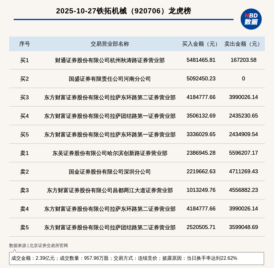 每經(jīng)訊,2025年10月27日,北交所上市公司鐵拓機(jī)械(920706,收盤價(jià):25.4元)登上龍虎榜,交易方式是連續(xù)競(jìng)價(jià),披露原因是當(dāng)日換手率達(dá)到22.62%,成交數(shù)量957.96萬(wàn)股,成交金額2.39億元。買一席位為財(cái)通證券股份有限公司杭州秋濤路證券營(yíng)業(yè)部,買入548.15萬(wàn)元;賣一席位為東吳證券股份有限公司哈爾濱創(chuàng)新路證券營(yíng)業(yè)部,賣出559.62萬(wàn)元。