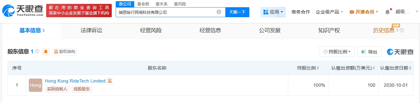 每經(jīng)AI快訊,天眼查App顯示,近日,瑞麗哈行網(wǎng)絡(luò)科技有限公司成立,法定代表人為丁銳,注冊(cè)資本100萬美元,經(jīng)營(yíng)范圍包括旅游業(yè)務(wù)、供電業(yè)務(wù)、網(wǎng)絡(luò)預(yù)約出租汽車經(jīng)營(yíng)服務(wù)等。股東信息顯示,該公司由哈啰出行旗下HongKongRideTechLimited全資持股。