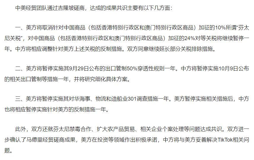 中美經(jīng)貿(mào)團隊通過吉隆坡磋商,達成的成果共識如下圖所示。
